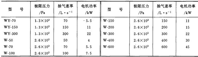 4.生产厂家 淄博真空设备厂 SK-0.4~SK-60,2SK-0.8~2SK-30,SZ-1,SZ-2,SZ-3,SZ-4,SZB4,SZB-8,2SK-0,8P1~2SK-30P1。 浙江真空设备厂 SZ-1,SZ-2,SZ-3,SZB-8,SK-0.08,SK-1.5,SK-3,SK-6,SK12,SK-25,2SK-1,2SK-1.5,2SK-3,2SK-6,2SK-12,2SK-25。 上海真空泵厂 SZ-0.5,2S-185,2S-185A,2S-230,SS-80。 沈阳真空机械三厂 SZ-1,SZ-2,SZ-3,SK-3,SK-6,SK-20。 南京真空泵厂 SK-3,SZB-1.5,2SK-1。 佛山水泵厂 2BE103-1,2BE1353-0,2BE1403-0,2BE1356-1,2BE1405-1,2BE1505-1,2BE1605-1,2BE1705-1,SK-12~SK-250,2SK-0.8,2YK-110P1,2YK110P2,2YK-110P3,SK-60P1,SK-60P2,SK-42P1,SK-42P2,2YK-27P1A,2YK-27P1,2YK-27P2。 广东省肇庆市迅达真空成套工程有限公司 2SK-1.5,2SK-3,2SK-6,SK-1.5,SK-3,SK-6。 新乡水泵厂 SK4.7,SK7,SK15,SK20,SZ-1,SZ-2,SZ-3,SZ-4。 唐山水泵厂 SZ-1,SZ-2。 大连耐酸泵厂 SZ-1~SZ-4。 哈尔滨水泵厂 SZ-1~SZ-4。 成都水泵厂 SZB-4 SZB-8。 博山真空泵厂 SZB-4 SZB-8。 (二)W型往复式真空泵 1.结构特点 (1)W型真空泵适宜于在较高压强范围内使用,极限真空2000Pa左右,整个结构原件装在一个封闭的曲轴箱内,连杆把曲轴和十字头连接起来,通过连杆和十字头的作用,使活塞在汽缸中做往复运动,周期性地改变吸排气腔的容积,并依靠吸排气阀的作用完成吸排气动作,从而获得真空。 (2)冷却水自气缸前端气缸下面进水口流入,经过气缸盖、气缸和气缸颈的水套在气缸后端气缸颈上面出水口流出。W-30气缸颈和气缸盖无水套,冷却水自气缸前端气缸盖下面进水口流入,经气缸的水套,在气缸盖上面出水口流出,流动在气缸水套中的冷却水,把气缸中因气体被压缩而产生的热量,和因摩擦而产生的热量带走,使气缸不致过热而影响正常工作。 2.主要技术参数 见表9-9-31。 表9-9-31 往复式真空泵技术参数表