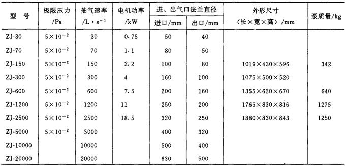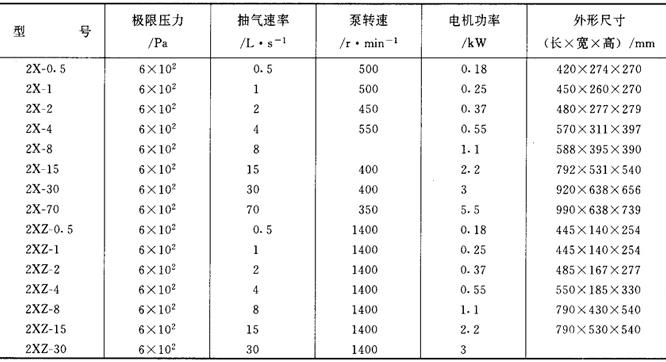 3.生产厂家 北京仪器厂 2X-1~2X-15,2XZ-2~2XZ-8。 南光机器厂 2X-0.5~2X-70。 广东真空设备厂 2X-0.5~2X-70,2XZ-1。 上海真空泵厂 2X-2~2X-70,2XZ-0.5~2XZ-30,XZ-2,XZ-4,XZ-30,XZ-45,XZ70。 淄博真空设备厂 2X-2~2X-70,2XZ-0.5~2XZ15,2X-30,X2-70。 锦州真空设备厂 2X-1。 沈阳真空泵厂 2X-0.5~2X-30,2X-0.5,2X-2,XZ-0.1,XZ-0.2。 沈阳真空设备厂 2X-1~2X-150,2XZ-4,2XZ-8,2X-4,XZ-8。 沈阳真空机械泵厂 2X-1~2X-150。 沈阳教学仪器厂 2X-1~2X-8,2XZ-0.5,XZ-0.2。 南京真空泵厂 2X-0.5~2X-70,XZ-8,2XZ-2。 浙江临海精工真空设备厂 2XZ-0.25~2XZ-8。 温岭真空机械厂 2X-4,2X-8,2X-15,2XZ-0.3,2XZ-0.5,2X-0.1。 浙江温岭真空仪器厂 2XZ-1~2XZ-8。 浙江真空设备厂 2XZ-0.25,2XZ-0.5~2XZ-8。 广东迅达真空成套有限公司 2X-2,2X-4,2X-30,2X-70。 沈阳真空机械厂 2X-15,2X-30,2X-70。 (四)罗茨真空泵 1.结构特点 该泵可抽除大量水蒸气,适用于蒸馏、蒸发、冷冻干燥等生产过程,亦可以作其他大型高真空泵的前级泵。 2.主要技术参数 见表9-9-34。 表9-9-34 型号说明:ZJ-150 ZJ-机械增压泵;150-抽气速率(L/s)