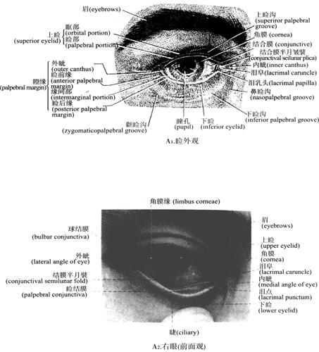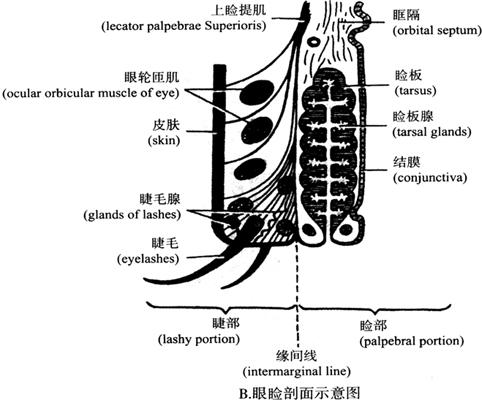 眼睑表面能见到的结构(图13-6A、B)有:眉(supercilia)、上睑及上睑沟(superior eyelid and superior palpebral groove)、下睑(inferior eyelid)、内眦(inner canthus),所形成的角钝圆,其中可见泪阜(lacrimal caruncle)、半月皱襞(semilunar plica)。外眦形成一锐角。上、下睑游离缘可见排列整齐的睫毛,在内侧可见泪乳头(lacrimal papilla),上有小孔叫泪点(lacrimal point)。在正常情况下,只有翻转眼睑后方能见到泪点。有些老年人、麻痹性、瘢痕性等所致的睑外翻(ectropion),都有可能使泪点变位,而引起泪溢症(epiphora)。
