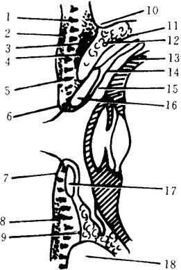 图13-1 眼睑部矢状面解剖图 1.眶隔前结缔组织 2.皮下脂肪 3.眼轮匝肌 4.眶隔 5.睑板前结缔组织 6.上眼睑 7.下眼睑 8.眼轮匝肌 9.眶隔 10.额骨 11.提上睑肌 12.眶隔脂肪 13.球结膜 14.米勒氏肌 15.睑结膜 16.上睑板 17.下睑板 18.上颌骨 【眼睑的构造】 1.皮肤及皮下组织层 眼睑皮肤在全身皮肤中最为薄弱,尤以上睑为甚,仅厚约0.3mm。皮下组织缺乏脂肪薄而稀疏。因此,眼睑皮肤富有松弛性和伸展性,这在美容外科手术具有重要意义。 2.眼轮匝肌 此肌位于皮下组织与睑板和眶隔之间,围绕睑裂分布。眨眼是靠眼轮匝肌的收缩运动完成的。眼轮匝肌可分为眶、眶隔前和睑板前三部分。眶部眼轮匝肌位于眶缘表面呈环形,可随意收缩挤压睑裂使之紧闭,睑板前部眼轮匝肌在内段分为浅、深两头。浅头与睑板联合组成内眦韧带,止于泪前嵴;而深头达泪囊后方,止于泪后嵴称为Horner肌。睑板前眼轮匝肌有其特殊的重要性,它使眼睑与眼球紧贴并维持眶鼻沟的深度,当浅在的内眦韧带被切断时,它与泪囊可防止下睑外翻。 3.睑板 上、下各一块,作为眼睑的支架,使眼睑保持一定的形状和硬度,由坚韧的纤维组织构成。上睑板较大且厚,呈半月状,宽7~9mm,厚1mm;下睑板薄而窄,宽为5~7mm。其内、外端与内、外眦韧带相连。 4.上睑提肌 呈菲薄的横纹肌,末端成为宽阔的腱膜附于睑板前面,并向内外作扇形展开,在其肌腹与腱膜交界处形成抑制韧带,受动眼神经支配,其功能是提上睑。米勒肌位于眶隔后面贴附于上睑提肌腱膜后面,是块极薄的受交感神经支配的平滑肌,它止于睑板上缘。 5.眶隔 为二层互相以直角相交的纤维组织的筋膜,起自上、下睑的睑板的前面,在上睑与睑提肌腱膜混杂,止于眶缘,将眶、睑隔开。 6.眶脂肪 其周边缘以通过眼外肌之间的五个孔道与眶隔接触,当年老而眶隔松弛时,眶内脂肪可膨出。 7.结膜 为眼睑的内层衬里,可分睑结膜、球结膜和穹窿结膜。睑结膜紧贴于睑板的内侧面,紧密而难以分离。穹窿结膜位于睑、球结膜之间,甚松弛,表面有许多水平皱褶,可用做修复组织。球结膜附于眼球表面。 【眼睑的神经】 眼睑的感觉和运动由面神经分支,眼窝下神经,滑车上、下神经和眼窝上神经及泪腺神经支配。面神经支配眼轮匝肌和额肌,而动眼神经支配上睑提肌。 【眼睑的血管】 眼睑的动脉源于面动脉和眶动脉,浅层组织由各动脉分支互相吻合的动脉网供应,深部则由4条动脉弓供应,即上、下睑的睑缘动脉弓和周边动脉弓。睑缘周边动脉弓距睑缘约3mm,位于睑板与眼轮匝肌之间。上睑周边动脉弓居上睑提肌腱膜和米勒肌之间,沿睑板上缘走行,故又称睑板上弓。 |
