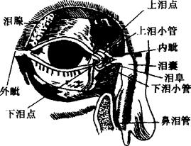 图4 眼睑结膜、泪器示意图 三、泪器 由分泌泪液的泪腺和排泄泪液的泪道两部分组成(见图4)。 1.泪腺 位于眼眶前部外上方的泪腺窝内,开口于上穹窿部结膜。它的主要作用是分泌泪液到达结膜囊,润滑角膜和结膜,同时泪液内含有溶菌酶,故泪液也具有清洁和杀菌作用。 2.泪道 排泄泪液的通道由泪点、泪小管、泪囊及鼻泪管组成。泪点位于内侧睑缘,上下各一,在泪囊与泪点之间是通过泪小管连结的,泪囊位于泪囊窝内,前面有内眦韧带,下端与鼻泪管相通,通向鼻腔。泪液进入结膜囊后,依靠瞬眼动作的吸引力,将泪液引入泪道。所以正常人的眼睑,总有一定量的泪液润滑眼球,但如果发生泪道阻塞,泪液不能从泪道排出,就会出现结膜囊内泪液过多,表现出眼睛湿汪汪像要有眼泪流出来的症状,这种症状在临床上称为泪溢。 四、眼外肌 眼肌分内外两组。眼内肌在眼球内,指瞳孔括约肌、瞳孔开大肌和睫状肌。眼外肌共有六条,分别为上直肌、下直肌、内直肌、外直肌、上斜肌和下斜肌(见图5)。