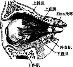 图5 眼外肌的侧面观(左眼) 上、下、内、外四条直肌和上斜肌均起始于眶尖部视神经孔周围的总腱环,向前附着于眼球前部的巩膜上,又被结膜覆盖。下斜肌起始于后眶壁的内下缘附着于眼球的后外侧。六条肌肉的功能是保证眼球各方向注视自如,如果其中一条或几条肌肉出现异常,可发生复视和斜视。 五、眼眶 就是我们用手可以触知的眼周围的骨性部分,眼眶事实上是一个立体结构,是一个水平的四边锥形的骨窝。分为上下、内外四壁,起容纳保护眼球及眶内容的作用,正常成人眼眶深约4~5厘米,眼眶内除眼球、眼外肌、血管和神经等重要组织外,其他空隙由脂肪充填,对眼球具有软垫样保护作用。眼眶除外侧壁较坚固外,其他三壁管壁很薄,且与额窦、筛窦、上颌窦、蝶窦相通,故这些窦有病变时,常会累及眶内。眶尖部即四边锥形的顶端有一个孔叫视神经孔或视神经管,长4~9毫米,宽4~6毫米,视神经及眼动脉由此穿过,所以如果视神经管由于外伤发生骨折,则会伤及视神经,而导致视力急骤下降或丧失。 |