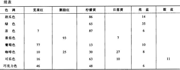 几种色调混合配比见表1-3-10。 表1-3-10 几种色调的食用着色剂配合比 单位:%