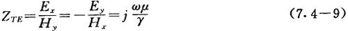 式中,v——TEM波在媒质中的波速,在真空中v=c。 由式(7.4-7)可知,vp>v,即矩形波导内TE波和TM波的相速大于TEM波的波速;vp是频率的函数,因此矩形波导是一种色散传输系统;vp与传播的波型有关。 3)群速vg 群速是等幅度点前进的速度,也就是能量传播的速度。群速vg与vp和v有如下关系: vgvp=v2 (7.4-8) 由上式知,矩形波导中波的群速小于TEM波的波速v。 4)波阻抗 矩形波导的波阻抗在数值上规定等于横向电场和横向磁场的比值。对于横电波(TE波),