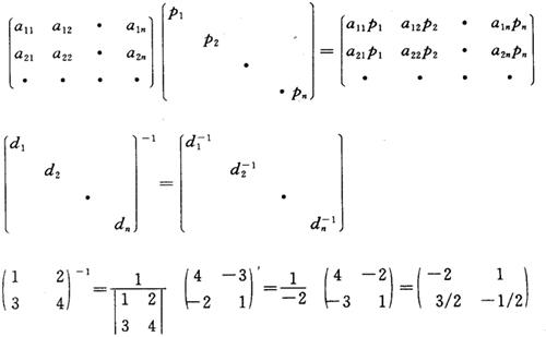 即C的i行j列元素cij,为A的i行各元素与B的j列各对应元素乘积之和。 3.求逆 对于方阵A,若 AB=BA=I 则称B为A的逆,记为B=A-1,A有逆的充要条件是A的行列式非零(即|A|≠0,亦称A非异)。逆可由下式计算