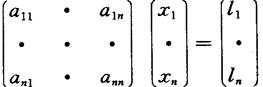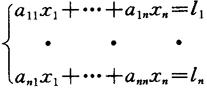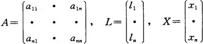 由测得的已知数l1,·,ln,求x1,·,xn时,首先将系数aij,已知数li,待求数xi用矩阵表示为: