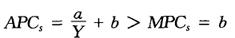 在短期内,消费者可借款度日,因此存在自发性消费,它独立于收入;但在长期内,没有收入就没有消费,因此OL过原点,收入为零,消费也为零。可以看到,短期内平均消费倾向(APCs)大于边际消费倾向(MPCs),即: