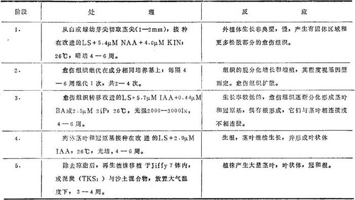 图22-1 全雄F1杂种种子生产的超雄子代的培育方案 A.雄性两性花植株杂交产生全雄品种 B.测定区分细胞遗传不同雄株 2.石刁柏育种单倍体和纯合系 由于石刁柏是异交授粉植物,具有高度自然异质性。许多情况下,要求产生完全同质植株,方法是取得单倍体,继而加倍单倍体染色体。单倍体可由二种方式产生:选择多胚种子(0.23单倍体/1000种子)和花药培养。经秋水仙素处理后,取得可育同质雌株。产生同质植株的最有希望方法是,诱导花粉或花粉母细胞直接产生单倍体。 用异质雌、雄和超雄(YY)植株杂交后代进行的栽培品种比较试验,证实雄性F1杂种产量比老栽培品种和供试双杂交的为高。用经测试配合力的自交超雄基因型与不同雌株杂交产生的全雄F1杂种,可能得到高产。用经花药培养产生的二倍体纯系杂交取得全雄F1杂种平均芽重和其平均直径比较结果,同质F1杂种并非在所有情况下产量与品质都超过雌雄异株栽培品种。结果指出花药培养产生的纯合植株的后代间有更大差异。由此,花药培养产生超雄植株可能不是取得高产全雄F1杂种的前提;必须供测其配合力,和与异质或同质雌性基因型的自交系。原则上,植株的同质性对培育高产石刁柏栽培品种并无裨益。雌雄同株自花授粉创造着宽广遗传基础的F1杂种,可组成四种基因型组合的混合体,相当于双杂交杂种。Fiala与Jolivet(1979)解释雄株的较高芽生产量,证实了2-4年老株根内,积贮性专化的贮藏物。 (二)研究进展 石刁柏再生潜力低,常规分冠繁殖成功有限,改用在高温度下的钵栽石刁柏茎发育空气冠进行营养繁殖。细胞培养中,偶得空气冠,大都用抑制主茎或侧芽生长后,从外植体基部产生。由分取个体冠和诱导空气冠,不易产生遗传上一致植株。只有人工培养技术证明了是大量产生特殊选择的亲本植株或栽培品种的适宜方法。从茎尖取分生组织和芽尖,和大田生长的蕨或白石刁柏幼芽作外植体取得了完整植株。初步试验在无菌条件外建立插枝生根未获成功。依靠营养培养基成分,外植体器官发育成芽,继之生根或产生不同时期脱分化的愈伤组织。 1.器官培养不经形成愈伤组织繁殖石刁柏 消毒后,从大田生长幼芽幼侧枝上切取茎尖(约长0.15mm)供无性繁殖。这种外植体含有分生组织尖盖和少数叶原基。较大外植体生存频率较高,并较大倾向长成多幼芽和愈伤组织,而较小的形成完全再生植株。培养基成分如下: 无机组成: MS 有机组成: NAA 0.3μM KIN 0.49μM 盐酸硫胺素 2.96μM 盐酸吡哆醇 0.024mM 烟酸 0.04mM 肌醇 0.55mM 硫酸腺素·2H2O 0.15mM 甘蔗糖 0.07M 其它成分 Difco Bacto麦芽提取物 500mg/l NaH2PO4·H2O 1.23mM Difco Bacto琼脂 6.0g/l 若干学者采用上述方法取得同样结果。附加细胞分裂素和生长素浓度变动在0.3-1.4μMKIN和0.5-1.6μM NAA。矿质营养成分变化,尤其是KNO3较高1.66(与MS相比),在加0.5μM NAA时,影响外植体分生组织生根。再者,各种大小茎和茎尖生根,用0.5μM NAA不加KIN继代中发生。不定芽旺势有赖于它们的年龄,从而影响生根能力。经4-8周生根期后,4和5月龄再生植株结果最好。自取外植体到再生植株移栽入土需时6-8个月,或12-14个月。离体培养建立原种母株后,培养其侧芽,可用于进一步营养繁殖。继代芽的繁殖率视茎旺势和芽位置而定;茎基部和中部产生更完整再生植株。茎尖培养形成植株最适温度为27℃。幼芽和根启动的最适光强为1000勒克斯,光周期16h,强达3000lx对茎和根启动可相等满足。茎尖基部类愈伤组织胀肿块内的不定启动成根,幼芽则是侧芽生长结果。 再生植株移植,提出在加蔗糖营养培养基培养的带根分生组织是异养的,不能形成冠部,不能适应园艺栽培条件。Haseyawa等(1973)认为形态缺陷也是移植失败原因。因为强光能促进幼芽上分化叶状枝,为此推荐用移栽前在强光10000lx下再结养,以取得较好效果。但是在3000lx,移栽植株的存活未看到显着降低。从试管内移栽后,立即用塑料膜盖上,保持相对低温下,相对湿度90%比70%的生存率较高。很小茎尖直接发育成完整再生植株,不经愈伤组织阶段,提供遗传稳定性。Hasegawa等(1973)报道细胞培养产生的植株染色体数与亲本相同。应用茎尖培养,取长0.1mm分生组织作外植体,可能消除病毒侵染(Yang,1979)。消除石刁柏病毒AV-1,可用0.1-0.3mm茎尖,但AV-2则应采用无叶原基的较小分生组织。 2.器官外植体启动愈伤组织培养物再生石刁柏植株 取茎尖作为插枝直接生根取得克隆繁殖成功。这种方法每插枝只能产生一株或用原初外植体基部分枝时,产生少数植株。繁殖率低曾与移栽入土后生存率低有相关。为了增高营养繁殖植株数,进行了形成愈伤组织和再生不定器官试验。用茎尖、幼芽尖和侧生分生组织,幼芽基部切段的髓组织,叶状枝的单细胞作为启动外植体,在基础培养基附加2,4-D和NAA配合不同细胞分裂素,诱导形成愈伤组织。愈伤组织培养体保持在固化和液体培养基中,用适当浓度荷尔蒙,促进器官建成。 高度液泡化愈伤组织细胞分化的第一步,是使它们转化成细胞质浓,类分生组织,或胚胎发生集团的细胞。采取失绿茎0.5厘米,培养在Galston-Loo培养基附加27.μM NAA。Gorter(1965)诱导基部有根启动的愈伤组织在加硼酸液体培养基中发育成再生植株。无菌幼苗下胚轴培养在LS加4.5μM 2,4-D和1.5μM KIN取得生长旺盛愈伤组织,经继代在成分相同的液体培养基中短时间内,其生长模式改变。多数浓密细胞集