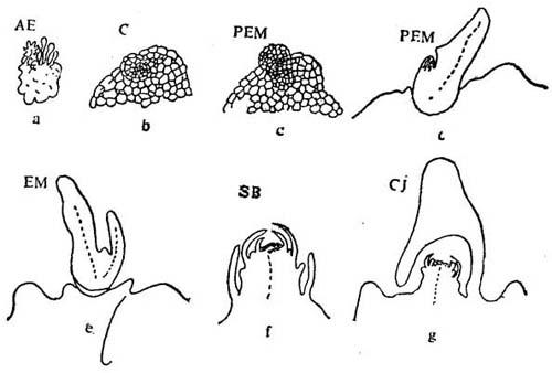 a.Linsmier-Skoog(1965),改用高浓度KH2PO4(1.84mM)和KNO3(24.7mM)。 增殖中愈伤组织的组织学研究指出,愈伤组织细胞是圆形,高度液泡化,细胞质膜极薄,沿着细胞壁,细胞间隙宽大,无储藏代谢产物(增殖中愈伤组织的高度液泡化细胞;改进的LS+5.4μM NAA+4.6μM KIN)。愈伤组织细胞转化成具有器官建成潜力的细胞,首先在细胞质里出现蛋白质合成,继而分泌到液泡中去(在LS+5.7μM IAA+0.44μM BA的增殖中愈伤组织的发育,细胞内细胞质含量增加,细胞质里的蛋白质微滴,经液泡膜进入液泡,有些细胞在类分生组织细胞中心区域沉积淀粉,形成原维管束鞘)。这些颗粒移入液泡中央,融合成较大,形状不规则的蛋白质体。在器官形成过程中,蛋白质微滴被代谢了。代谢作用与继后有丝分裂活动相关联(不规则形状的蛋白质,表示分解的不同时期,同时细胞质增大)。下一阶段的器官建成出现原形成层原基分布不规则,和在愈伤组织表面上出现茎叶芽(由增大的叶状体形成的茎叶原基包埋在一个腔内)。有可能石刁柏愈伤组织内储藏组织的这种分化模式,是器官发育的前提。 曾鉴别出二种茎叶的不同组织类型(图22-2)。来源于愈伤组织表面层,这些芽包含着顶尖分生组织,在包埋顶尖的鳞片轴内的叶状体原基,在愈伤组织内层里与假导管节松散连接的原形成层股段(图22-2a)。一般言之,这些芽生长很快,光下转绿,在基部常发育成具有有限生长能力的白色冠原基(图22-2b)。组织学上看,这些圆筒形白色单元,包含一个茎叶芽,包埋在由长组织被膜形成的穴内(图22-2d)。过去错误地把这些组织是胚(由于它们的形状和大小与体细胞胚相似)。体细胞胚胎发生特征是分隔成多细胞、球形、原胚胎发生细胞复合体,围以原表皮层。原胚伸长成双极结构,茎叶与根极,其间多少为愈伤组织隔开。与其它单子叶植物如鸢尾的体细胞胚胎发生相比较,石刁柏胚与合子胚的结构不同。