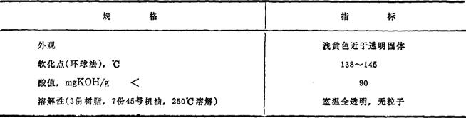 性能 淡黄色近透明固体。软化点较松香高、酸值低、成膜后硬度、光泽均较松香好,但脆性大。耐候性差些。 质量规格(参考)