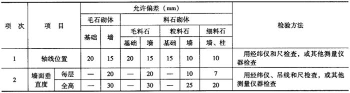 | 释义 | 石砌体工程的质量要求 (一)石砌体工程的一般规定 (1)石砌体采用的石材应质地坚实,无风化剥落和裂纹。用于清水墙和柱子表面的石材,还应当色泽均匀。 (2)用于石砌体的石材,其表面的泥垢、水锈等杂质,在砌筑前应清除干净。 (3)石砌体的灰缝厚度:毛料石和粗料石砌体不宜大于20mm;细料石砌体不宜大于5mm。 (4)砌筑砂浆初凝后,如需要移动已砌筑的石块,应将原砌砂浆清理干净,重新铺浆后再进行砌筑。 (5)砌筑毛石基础的第一皮石块应采用坐浆法,并将石块的大面向下;砌筑料石基础的第一皮石块应用丁砌层坐浆法砌筑。 (6)毛石砌体的第一皮及转角处、交接处和洞口处,应用尺寸较大的平毛石砌筑。每个楼层(包括基础)砌体的最上面一皮,应选用较大的毛石砌筑。 (7)砌筑毛石挡土墙应符合下列规定:①每砌3~4皮为一个分层高度,每个分层高度应找平一次;②外露面的灰缝厚度不得大于40mm,两个分层高度间分层处的错缝不得小于80mm。 (8)用料石砌筑挡土墙,中间部分用毛石砌筑时,丁砌料石伸入毛石部分的长度不应小于200mm。 (9)挡土墙的泄水孔当设计中无规定时,施工应符合下列规定:①泄水孔的设置应均匀,在每米高度上间隔2m左右设置一个泄水孔;②泄水孔与土体间应铺设长宽各300mm、厚200mm的卵石或碎石作为疏水层。 (10)挡土墙内侧回填土必须分层填筑夯实,分层松土厚度应为300mm。墙顶土面应有适当坡度,以便使流水流向挡土墙外侧面。 (二)石砌体工程的主控项目 (1)石材及砂浆强度等级必须符合设计要求。抽检数量:同一产地的石材至少抽检一组。砂浆试块的抽检数量应执行“砌筑砂浆的质量要求”中(12)条的有关规定。检验方法:料石检查产品质量证明书,石材、砂浆检查试块试验报告。 (2)石砌体砌体的砂浆饱满度不应小于80%。抽检数量:每步架高抽查不少于1处。检验方法:观察检查。 (3)石砌体的轴线位置及垂直度允许偏差,应符合表3-9中的规定。抽检数量:外墙按楼层(或4m高以内)每20m抽查1处,每处3延长米,但不应少于3处;内墙按有代表性的自然间抽查10%,但不应少于2处,柱子不应少于5根。 表3-9 石砌体的轴线位置及垂直度允许偏差