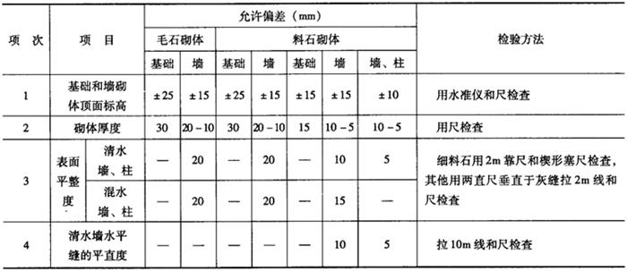 (三)石砌体工程的一般项目 (1)石砌体的一般尺寸允许偏差,应符合表3-10中的规定。抽检数量:外墙按楼层(或4m高以内)每20m抽查1处,每处3延长米,但不应少于3处;内墙按有代表性的自然间抽查10%,但不应少于2处,柱子不应少于5根。 表3-10 石砌体的一般尺寸允许偏差