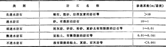 (据肖楠森等《水文地质学》) (5)透水性 指岩石允许水透过的能力。 岩石的透水性以定量指标——渗透系数(K)表示。 根据岩石的透水性,可把岩石分为5类,见表3-1-5。 表3-1-5 岩石透水性分类表