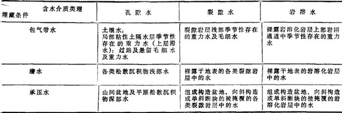 (据王大纯等《水文地质学基础》) 4.含水层与隔水层 含水层是指能够透过并给出相当数量水的岩层,即赋存有地下水的透水岩层。如疏松的砂层、砂砾层、孔隙和裂隙发育的岩层或岩溶发育的岩层,均可组成含水层。 隔水层是指不能透过并给出水或透过和给出水的数量微不足道的岩层,如粘土、泥岩、致密灰岩等。 含水层和隔水层的划分是相对的,并不存在截然的界限或绝对的定量标志。从某种意义上讲,含水层和隔水层是相比较而存在的。 5.地下水分类 地下水的赋存特征对其水量、水质时空分布有决定意义,其中最重要的是埋藏条件与含水介质类型。 埋藏条件:指含水岩层在地质剖面中所处的部位及受隔水层限制的情况。据此可将地下水分为:包气带水、潜水和承压水。 按含水介质类型,可将地下水分为孔隙水、裂隙水和岩溶水。 两种分类组合,可分为9类地下水,见表3-1-7。 表3-1-7 地下水分类表