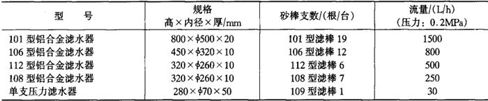 图4-12-1 砂棒过滤器结构 1-放气阀 2-原料水进口 3-排污阀 4-净水出口 5-下端盖 6-隔板 7-砂棒 8-砂棒拉杆 9-筒体 10-端盖 砂棒过滤器外壳常用铝合金铸成,砂棒的上、下两端各用箅子隔板固定。水从筒体侧面进入,杂质被外表面阻隔,水进入砂棒中心并向下集中后,由筒底排出而成为净化水。砂棒工作一段时间后,要打开过滤器,取出砂棒清洗。 (三)主要技术参数 砂棒过滤器的主要技术参数见表4-12-1。 表4-12-1 国产砂棒过滤器性能规格
