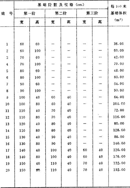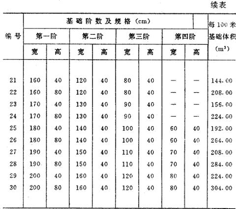 0.125×0.0625=0.0078m2 ②按级数公式求其两边单位长方形面积的块数; S=n(a+l)=4(1+4)=20 ③总面积 0.0078×20=0.156m2 ③折成加高计算 0.156÷0.37=0.422m a.砖基础折加高度计算法 计算公式为: V=L中(L内)×墙身宽度×(基本高度+折加高度) 〔计算例〕 某单位工程内墙基净长线为200米,墙身宽度为240毫米,砖基础为等高式三层大放脚,基本高度为1.50米,求砖基础工程量。