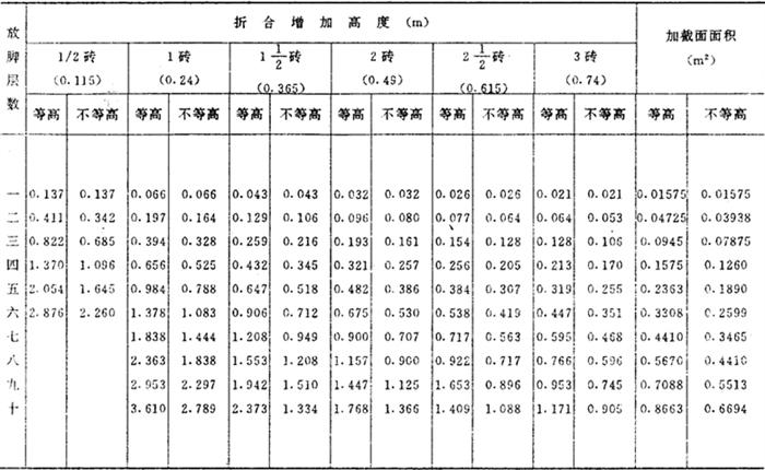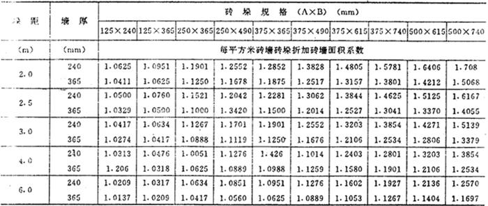 b.砖基础增加截面面积计算法 增加截面面积见表,其计算公式为: V=L中(L内)×(墙身宽度×基本高度+增加截面面积) [计算例] 仍以上题为例计算砖基础工程量。 =200×0.4545 =90.90m3 *见折加高度和增加面积数据表(见表2-10)。 ③砖墙 在计算工程量时,标准砖墙体厚度,按表2-11规定计算。 表2-11 标准砖墙体厚度表