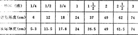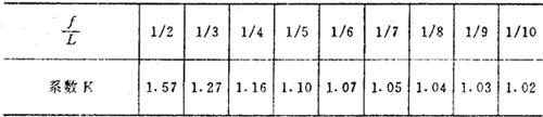 图2-21 式中 V-砖拱体积(m); d-拱厚; l-拱长; L-中心跨距; K-系数(见表2-14) 表2-14 矢高(f)与中心线跨距(L)的比值表