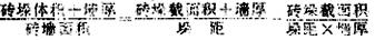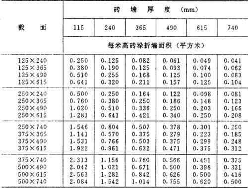 ⑥砖平碹、钢筋砖过梁 砖平碹、钢筋砖过梁,均按图示尺寸以立方米计算,如设计无规定时,钢筋砖过梁长度按门窗洞宽度两端共加50厘米,高度44厘米计算。砖平碹长度,可按门窗洞口宽度两端共加10厘米,高度按24厘米计算,其计算公式为; 砖平碹=(门窗洞口+0.10)×0.24(高)×B 钢筋砖过梁=(门窗洞口+0.50)×0.44(高)×B 砖垛折合砖墙面积表