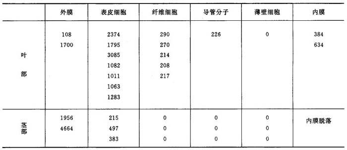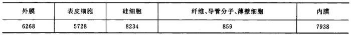 采用SEM-EDXA分析芦苇中硅在各类细胞中的分布情况,结果列于表2-7-11。从表中数据可以看出,苇叶和茎秆中硅的分布不一样。在茎秆中,除表皮细胞外,其它细胞基本上不含硅。但在苇叶中却不然,除表皮细胞含硅量高以外,在纤维细胞和导管细胞中也含有少量的硅。由研究结果可以判断,芦苇中的硅主要集中在表皮组织和叶部。对营口造纸厂酸法苇浆的SEM-EDXA分析结果(见表2-7-12)也证实表皮细胞中硅的峰值相当高,而纤维细胞中则很少。 表2-7-11 硅在芦苇各种细胞中的相对峰值