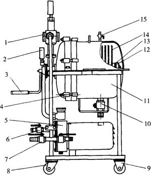 1-观察装置 2-压力表 3-摇把 4-卡子 5-自吸泵 6-入口阀门 7-出口阀门 8-活动脚轮 9-固定脚轮 10-排滞留物阀门 11-外壳 12-贝帽 13-密封圈 14-滤盘 15-排气阀