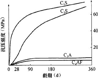如果改变水泥熟料中矿物组成的相对含量,水泥的技术性能也会随之发生变化,即可制成具有不同特性的硅酸盐水泥。如提高硅酸三钙的含量,可以制得高强水泥;提高硅酸三钙和铝酸三钙的含量,可以制得快硬水泥;降低硅酸三钙和铝酸三钙的含量、提高硅酸二钙的含量,可以制得水化热较低的中热水泥或低热水泥。水泥的各种熟料矿物组成强度增长情况如图4-2所示。