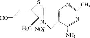 C12H17N5O4S 相对分子质量 327.36 性状 白色至微黄白色结晶或结晶性粉末,无臭或稍有特异臭,熔点196~200℃(分解),不吸湿。稍溶于水(其溶解度比盐酸硫胺素小,1g约溶于35mL水中),难溶于乙醇和氯仿。在空气中稳定,在中性溶液中比酸性溶液(pH4.0)中稳定。比盐酸硫胺素稳定。 制法 (1)由硫胺素的溴氢酸盐、硝酸和硝酸钾反应后,精制而成。 (2)由硫胺素盐酸盐经碱处理除去氯离子后,与硝酸作用制成。 质量标准