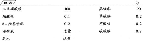 制法 将工业硝酸铵加入蒸馏水中,加热溶解。加入硝酸银溶液、草酸铵、8-羟基喹啉、硝酸钡等,充分搅拌,混匀。将溶液加热至沸,加入适量活性炭、碳酸铵,用氨水调pH值,使pH=12。过滤去渣,得到有氨味的透明滤液。让滤液冷却,结晶。所得结晶物用离心机甩干。然后于80℃左右烘干,得到成品。 |
