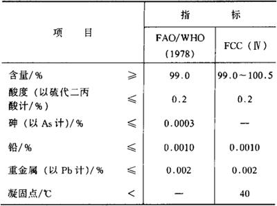 鉴别方法 以其凝固点低于40℃为依据。 毒理学依据 1.LD50 小鼠口服小于15g/kg(bw)。 2.骨髓微核试验 未见致突变性。 3.GRAS FDA-21CFR 182.3280。 4.ADI 0~3mg/kg(bw)(以硫代二丙酸计,FAO/WHO,1994)。 使用 抗氧化剂。 使用范围及使用量 (1)根据我国《食品添加剂使用卫生标准》(GB2760-1996)规定:可用于食用油脂、果蔬保鲜、含油脂食品,最大用量0.2g/kg。 (2)实际使用参考: ①选用新鲜的苹果、香蕉、土豆、洋葱,削皮后,用本品0.02%乳化液浸泡3min,取出后与对照组同时暴露于空气中,观察果蔬表层变褐的时间。经处理的果蔬与对照组相比,其褐变至同一程度所需时间延长了4.8~9倍。 ②经实验,添加200mg/L本品与200mg/L PG、BHA、BHT的猪油,在常温或60℃下贮存,其抗氧化能力为:DLTP≈PG>BHT>BHA。 |