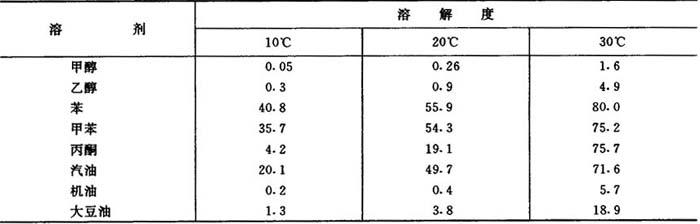 【释文】: 制法 由硫代二丙酸与月桂醇酯化而得。 性质 白色粉末或鳞片状物。分子量514.86。皂化值216~220。酸值<0.05。灰分<0.01%。挥发物<0.1%。相对密度0.915。熔点39~40℃。蒸气压267Pa(200℃)、40kPa(260℃)、17kPa(300℃)。溶解度见表4-18。 表4-18 硫代二丙酸二月桂醋的溶解度(g/100g溶剂)
