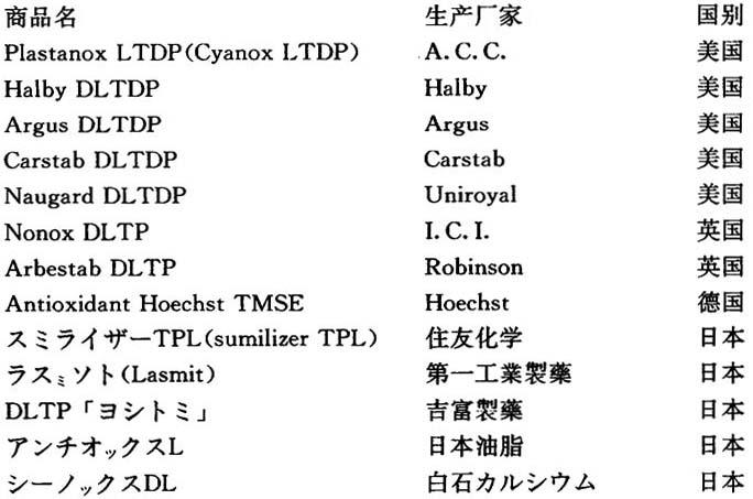 用途 本品具有分解过氧化物的作用。可作为聚乙烯、聚丙烯、ABS树脂、聚氯乙烯的辅助抗氧剂,不污染,不着色,高温加工时不分解,能充分发挥其热稳定效能,可显着改善制品的耐热性和抗氧性。与酚类抗氧剂(如抗氧剂1010、1076、CA等)和紫外线吸收剂并用有协同效应,一般用量为树脂重量的0.05~1.5%。本品也可用作天然橡胶和合成橡胶的辅助抗氧剂。 毒性 本品对大白鼠经口LD50>2500mg/kg体重,小白鼠经口LD50>2000mg/kg体重。用含本品3%的饲料喂饲大白鼠2年,动物的生长、死亡率及脏器等均未见任何异常。特鲁豪特(R.Truhaut)推算出的人体最大允许摄取量每日为3mg/kg体重。 美国、日本和西欧诸国许可本品用于制作食品包装材料。美国食品和药物管理局规定:本品用于接触脂肪性食品的制品时,含有本品的抗氧剂总量不得超过0.02%(参见FDA121.101)。日本对本品用于食品包装材料的用量限制是:聚乙烯0.5%、聚丙烯1%、AS树脂0.5%,ABS树脂1%、聚氯乙烯2%(溶出量<0.005%)。 国内生产厂 天津力生化工厂 国外生产厂