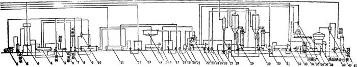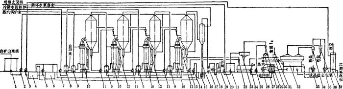 图3-4-16A 硫酸钠型岩盐卤水分离Na2SO4制盐工艺流程图 1-储卤桶 2、3-化工泵 4-杂水池 5-离心泵 6-事故池 7-冷凝水泵 8-闪发桶 9-冷凝水桶 10-蒸发罐 11-盐浆泵 12-水力旋流器 13-盐浆泵 14-冷凝水泵 15-水封池 16-气压式冷凝器 17-气水分离器 18-往复式真空泵 19-油分离器 20-化工泵 21-母液储桶 22-水力旋流器 23-沉盐器 24-盐浆诸槽 25-盐浆泵 26-离心通风机 27-离心机 28-水力旋流器 29-散热器 30-储碘桶 31-皮带机 32-沸腾干燥冷却器 33-离心通风机 34-干式除尘器 35-离心引风机 36-干式除尘器 37-湿式除尘器
