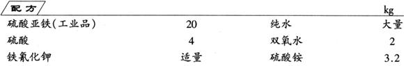 将硫酸亚铁投入耐酸反应缸中,加入40kg70~80℃的热纯水,在搅拌下溶解后,减压过滤。在其透明滤液中加入4kg硫酸和1kg双氧水,使亚铁氧化。当溶液变为棕色时,用铁氰化钾检验亚铁是否氧化完全,如未氧化完全,则生成蓝色沉淀。