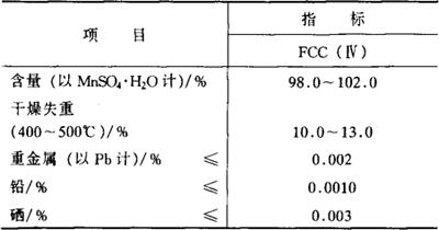 | 释义 | 硫酸锰 别名 硫酸亚锰 编码 GB 16.000 化学结构 MnSO4·H2O 相对分子质量 169.02 性状 淡粉红色颗粒或粉末,无臭,易溶于水,不溶于乙醇。相对密度2.95,加热到200℃以上开始失去水分,约在280℃时失去大部分结晶水。本品锰含量为32.5%。 制法 (1)软锰矿与煤粉按一定比例混合,经还原、焙烧得一氧化锰,再用硫酸酸解,精制而成。 (2)将生产对苯二酚的废液(含硫酸锰和硫酸铵)经石灰乳中和除杂后,脱氨精制而成。 质量标准
