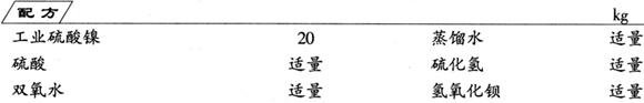 将硝酸盐含量大于0.5%的工业硫酸镍于70℃条件下煅烧后,冷却至室温。经煅烧后的硫酸镍加蒸馏水溶解,制成相对密度为1.25的水溶液。加入纯硫酸酸化至pH值约为1,通入硫化氢,直至重金属硫化物沉淀完全为止。将滤液加热,以逐出过量的硫化氢。加入双氧水氧化,再加入氢氧化钡,直至溶液呈中性,并检查至铁杂质含量已符合产品标准为止。上述沉淀物和水不溶物,用过滤法除去。滤液蒸发,浓缩至相对密度为1.43为止。让浓缩液冷却,结晶,甩干。干燥后密封包装,即为成品。