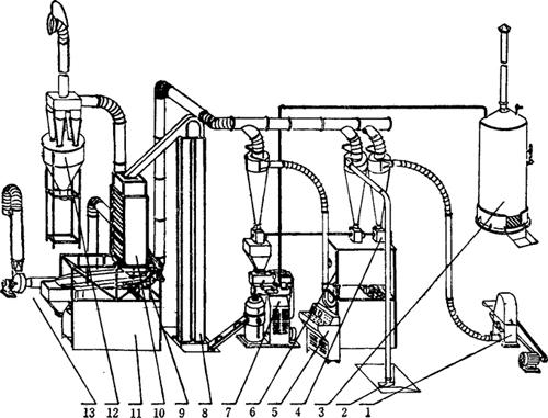 | 释义 | 硬颗粒饲料机 (1)硬颗粒饲料机组的成套设备 由饲料粉碎机、搅拌机、硬颗粒饲料机、斗式提升机、立式冷却器、振动筛、风送系统、配电箱及立式锅炉九大部分组成(图5-8),有电动机8台,容量为56.14瓦。每班需8-10人操作,每班产量5-8吨,产量500-900公斤/时,成形率大于95%,含水率小于13%。