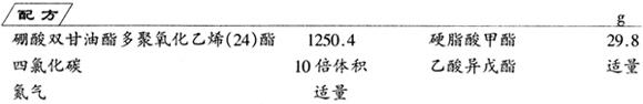 在装有搅拌器、温度计、气体流入管和计量管的四颈烧瓶中,放入硼酸双甘油酯多聚氧化乙烯(24)酯和硬脂酸甲酯,在氮气氛中徐徐升温到170℃,然后在170~180℃及4kPa减压条件下进行3h交换反应,排出甲醇,冷却到60℃,恢复常压,注入10倍体积的四氯化碳,使酯类产品和未反应的硼酸双甘油酯多聚氧化乙烯(24)酯分离。然后使酯层产品浓缩,交替使用乙酸异戊酯和四氯化碳进行精制,最后除去溶剂,得白色蜡状产品,酸值为36.6mgKOH/g(理论值37.0mgKOH/g)。