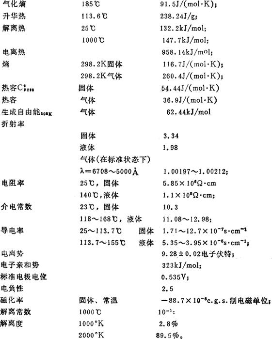 熔点 113.6℃; 沸点 185℃; 临界温度Tc 液体 553℃; 临界压力Pc 液体 11753700Pa; 临界密度 1.64g/cm3; 导热系数 24.4℃ 4.21×10-3J·cm-1,s-1·℃-1; 比热 固体 25~113.6℃ c=0.2118J/(g·℃); 熔融热ΔH熔融 113.6℃ 62.13J/g; 生成热ΔH生成 气体 25℃ 62.26kJ/mol; 气化热ΔH气化 185℃ 164.35J/g;