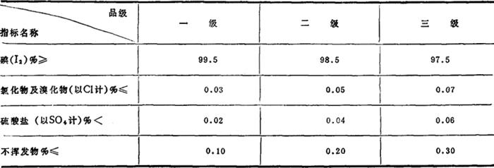 二、化学性质 碘不能直接与碳、氮或氧化合;与臭氧反应生成氧化物;与氟、氯、溴等反应,分别生成氟化物、氯化物及溴化物,与氨反应生成爆炸性的三碘化氮;在有水分存在时,与磷反应生成三碘化磷及四碘化二磷;与铂只能在高温下反应;与锆反应生成挥发性的四碘化锆;与其他多种金属可在常温反应,形成不挥发碘化物。碘在酸性溶液中是氧化剂,可氧化亚硫酸盐、重亚硫酸盐、硫代硫酸盐、亚砷酸盐、亚锡酸盐为硫酸盐、连四硫酸盐、砷酸盐及锡酸盐。强氧化剂可使碘氧化成碘酸或碘酸盐。碘与二氧化硫在无水甲醇与吡啶的混合液中不反应,但如有水分存在,二氧化硫即被氧化为硫酸,碘被还原为碘化氢。碘遇淀粉显蓝色。与饱和烃作用,在有氧化铅或碘酸存在时,碘可取代其中的氢;与不饱和烃作用,可在双键处加成,形成多碘化物。 三、用途 碘是制造无机和有机碘化物的基本原料。主要用于医药卫生方面,用以制造各种碘制剂、杀菌剂、消毒剂、脱臭剂、镇痛剂、放射性物质的解毒剂;碘化物也被用作饮水净化剂、游泳池消毒剂。在农业上,碘是制农药的原料,也是家畜饲料添加剂。在工业上,用于生产合成染料、烟雾灭火剂、照相感光乳剂、切削油乳剂的抑菌剂等;还用于制造电子仪器的单晶棱镜、光学仪器的偏光镜,能透过红外线的玻璃、皮革及特种肥皂等;在有机合成反应中,碘是良好的催化剂;碘也是松香、妥尔油及其他木材制品的稳定剂,烷烃和烯烃的分离剂,高纯度锆、钛、铪、硅和锗的提炼剂;碘还被应用于有机化合物的甲基化、异构化和脱氢反应。碘还用作分析化学试剂。 四、质量标准 我国碘的行业标准(ZBX38002-88)规定碘的感官指标为灰黑色具有金属光泽的片状或块状晶体,有辛辣的刺激味;化学指标应符合表1-1-38的要求。 表1-1-38 碘的化学指标