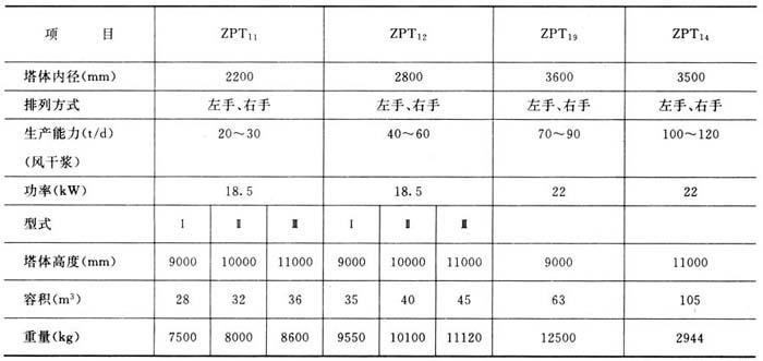 | 释义 | 碱处理设备 1.碱化塔 (1)结构原理 用于多段漂白的碱处理或碱精制。塔体由钢板卷成或用钢筋混凝土结构,浆料可直接由洗浆机下料或中浓浆泵送入塔顶,与碱充分混合后入塔,流经塔下部,用高压水稀释到了3%浆浓后,由泵抽到洗浆机。图6-6-16为降流式碱处理塔。为了碱处理时溶出物的扩散速率,常需通汽加温,一般采用40~70℃,故碱化塔必须作成耐压容器。 (2)主要技术参数 表6-6-7为上海化工机械厂生产的ZPT型降流式碱化塔的技术参数。碱化塔的设计计算与氯化塔相同。 2.快速压榨碱抽提 表6-6-7ZPT型降流式碱化塔主要技术参数