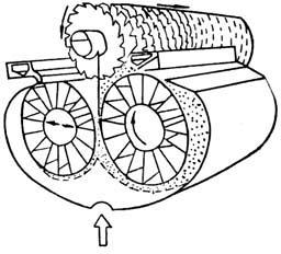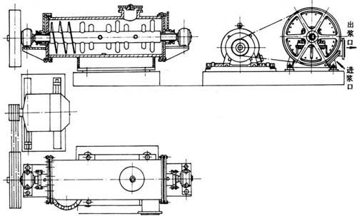 图6-6-17 双辊压榨机 3.浆液搅拌混合器 (1)单辊混合器 图6-6-18为单辊混合器示意图,混合器壳体为焊接的回柱体,开有若干蒸汽管接口和一个化学药液入口,两端为铸铁盖,用螺栓与壳体连接,搅拌辊前端为送浆螺旋,浆料由此进入,后端焊有若干对搅拌臂,每相邻两对按90°交叉排列。
