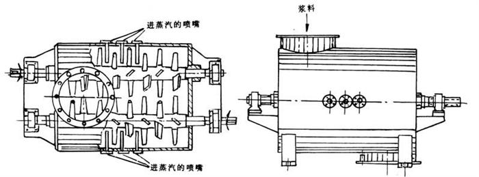 图6-6-18 单辊混合器 (2)双辊混合器 如图6-6-19所示,混合器壳体内装有两个按反向旋转的转子,转速大小不一定相同。双辊混合器可输入较多的蒸汽,浆料升温高,特别适合于混合高浓浆料,双辊混合器其它结构与单辊混合器相同。
