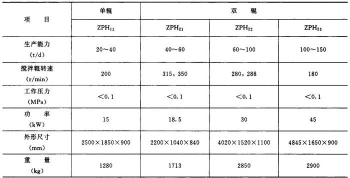图6-6-19 双辊混合器 (3)主要技术参数 单(双)辊混合器又称ZPH型混合机,表6-6-8为上海化工机械厂提供的几种型号。 表6-6-8ZPH型混合机