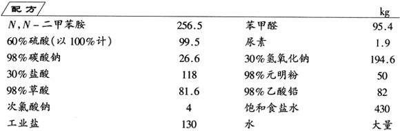 制法 (1)缩合 将256.5kgN,N-二甲基苯胺(包括前批回收的料)、95.4kg苯甲醛、97.5kg 60%硫酸和1.9kg尿素加入缩合反应釜内。密闭后于2h内边搅拌边加热升温至113~115℃,釜内压力为1.8×105~2.0×105Pa,保温反应12h。然后自然降温到100℃,表压约低于1.0×105Pa,减压。取样测终点。缩合收率约80%。 反应终点测定法:取缩合产物100g,加水400ml,搅匀,加入26.6kg 30% NaOH,至使酚酞试纸呈现红色。继续搅拌,冷至40℃时仍只是软黏物料,则反应还未完成。釜内物料应继续加热反应,直至达到终点。 在水蒸气蒸馏锅内加入660L水、168kg 30%的NaOH,边搅拌边投入上述缩合物,控制物料pH=10~11。然后直接通蒸汽回收过量的N,N-二甲苯胺,直至馏出液中无油珠出现为止。锅内物料即为碱性绿的无色色基。向锅内加入1~2kg的60%硫酸,调pH值至使酚酞试纸呈微红色。然后加水至总体积约2000L,搅拌,自然冷却至60℃以下,静置结晶,经2~3h,过滤,并用清水洗滤饼至中性。得碱性绿无色色基的粗品约264kg(干品计)。 (2)氧化(上述缩合物分三批氧化) 在氧化反应釜中加水40L,30%盐酸10kg,边搅拌边加入上述无色色基干品88kg,在25~30℃下搅拌5~6h,至全部溶解。 在另一锅内加水200L,边搅拌边加入由次氯酸钠氧化乙酸铅制得的PbO2 66kg,加水至总体积约270L,在25℃搅拌5h。 将氧化反应釜内已溶解好的无色色基溶液,加水直至总体积为1800L,搅拌15min,取样分析,用108kg 30%盐酸进行调节。加冰及水至总物料体积约2400L,温度16℃。在2min内迅速加入已配好的二氧化铅浆状物料进行氧化反应,搅拌15min,温度在21℃左右。氧化完毕后,于45min内先慢后快地加入430kg饱和食盐水,接着在45min内加入130kg工业食盐,温度为26~28℃,析出碱性绿的二氧化铅复盐,为闪光绿色结晶。搅拌2h后过滤,得湿滤饼约330kg。 (3)脱铅 在脱铅锅内放入2400L水,加热至50℃,边搅拌边加入50kg元明粉,搅拌,使之全部溶解。然后将一批氧化物料全部加入,温度维持在48~50℃,搅拌1h。静置分层,上部清液经过滤,直接送至中和锅。下部浆状物为硫酸铅,在搅拌下放出过滤,用40℃清水洗涤滤饼,至清洗液不显绿色为止,清洗液也送至中和锅。湿滤饼(硫酸铅)约100kg。硫酸铅可用次氯酸钠氧化为二氧化铅后回收。 (4)中和 将已脱铅的碱性绿溶液加热(夏季35~36℃;冬季38~39℃),在2h左右先慢后快地加入26.6kg纯碱(先溶于200L水中,配成溶液),控制料液pH=8.4~9.0(酚酞试纸呈微红色)。搅拌约3h,至液体物料无色后,静置0.5h分层,上层为隐色体(或称色基),下层为稀碱液。过滤,滤饼用水洗涤至中性。得色基约79kg(干品计)。收率约85%。 (5)结晶 在溶解锅中加入81.6kg 98%草酸及79kg色基,再加入前批的草酸结晶母液(含色基5%以下)约800L,加热至60~65℃,保温0.5h,使色基完全溶解,停止搅拌,静置0.5h。过滤,将沉淀放入结晶槽内保温结晶。槽内插有Φ10mm的铜棒,结晶的碱性绿附着在铜棒上。结晶数天后取出晶体,于45℃左右烘干,即得成品。母液过滤后下批重复使用。烘干后的成品用内衬塑料袋的铁桶盛装。 碱性绿又称盐基绿、碱性快绿、孔雀绿、艾坚孔雀绿、维多利亚绿、阿斯特拉宗绿M。染料索引号C.I.碱性绿4(42000)。分子式2(C23H25N2)·3C2H2O4。 本品为一般性碱性染料,主要用于腈纶、蚕丝、羊毛、二醋纤、单宁媒染棉纤维的染色。也用于麻、皮革的染色及用于制造色淀、溶剂染料和竹、木、纸张、草制品着色剂。N,N-二甲苯胺剧毒,吸入蒸汽或经皮肤吸收将引起中毒,操作必须配戴防护用具,严格执行操作规程,避免反应液溅至皮肤及眼内。 碱性绿装于铁皮桶内,并加密封及封印。贮运时防止受热受潮,贮存于通风干燥处,应避免日照。 |