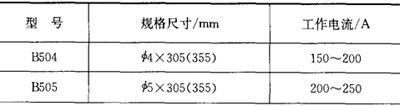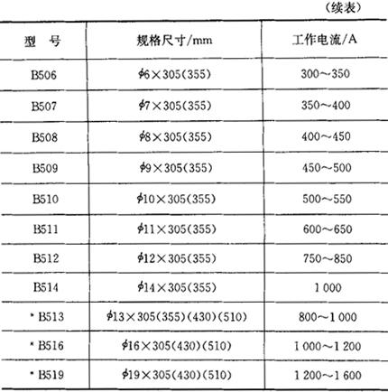 在型号后面有的附加了字母,其字母含义: (1)末尾带“K”,表示直流圆形空心碳棒; (2)末尾带“L”,表示直流连接式圆形碳棒; (3)末尾带“J”,表示交流圆形有芯碳棒。 表2.6-3、表2.6-4列出了圆形和矩形碳棒的规格与工作电流。 表2.6-3 直流圆形碳棒