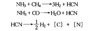| 释义 | 碳氮共渗 碳氮共渗又称氰化,它是将碳原子和氮原子同时渗入钢件表面的过程. 碳氮共渗按工艺温度分为:低温碳氮共渗(520~580℃),由于工艺温度低,共渗过程以氮原子为主,而渗碳次之,故又称为氮碳共渗或俗称“软氮化”;中温碳氮共渗(780~880℃);高温碳氮共渗(880~930℃).碳氮共渗工艺的优点是: (1)与渗碳相比处理温度低,渗后可直接淬火,工艺简单,晶粒不易长大,变形裂倾向校能源消耗少,共渗层的耐疲劳性、耐磨性和抗回火稳定性好. (2)与渗氮相比,生产周期大大缩短,对材料适用性广. 15.6.8.1 碳氮共渗 1.气体碳氮共渗 在渗碳气氛加氨气的共渗过程中,碳原子和氮原子会按一般的方式同时进行渗碳和渗氮.另外,由于氨气的引入,还发生如下反应: