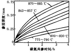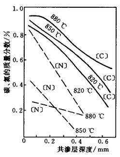 图15-36 共渗温度对渗层C、N浓度分布的影响 共渗温度和时间是重要的工艺参数.共渗温度对渗层碳、氮原子的浓度、渗入深度的影响见图15-36及图15-37.另外,共渗温度对渗层的化合物相、马氏体开始转变及转变终了温度也有影响.因此,综上所述,共渗温度一般选择820~870℃.共渗时间应根据共渗温度、渗层厚度、渗层性能及钢的化学成分而定.渗层深度与时间的关系见图15-38.