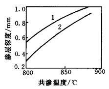 图15-37 温度对10号钢的渗碳层与碳氮共渗层深度的影响(停留3h) 1—煤油热解气+25%氨;2—煤油热解气