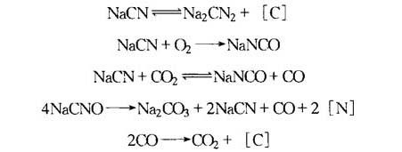 图15-38 在工业生产中关于时间和温度对碳氮共渗层深度影响的调查结果 2.液体碳氮共渗 液体碳氮共渗是将工件置于能产生活性碳氮原子的盐浴中进行的共渗过程.盐浴的温度在钢的Ac1以上,碳、氮原子同时渗入工件表面形成共渗层,然后淬火获得硬化层.由于加热快而使得工艺时间短.液体碳氮共渗的渗层深度一般≤0.25mm. 盐浴中有氰盐NaCN、KCN、K4Fe(CN)6、K3Fe(NH)6,以提供活性碳;还有中性盐Na2CO3、NaCl、KCl、BaCl2,用来调整熔点. 盐浴中发生的两种主要反应是“氰氨转换”和氰酸盐的形成,反应式为: