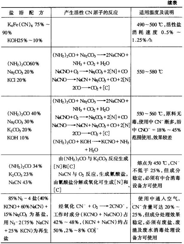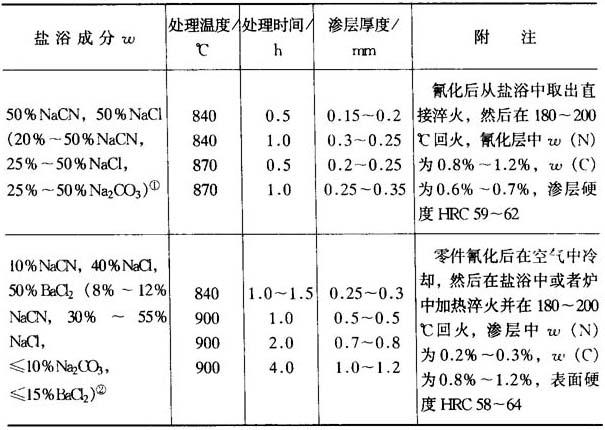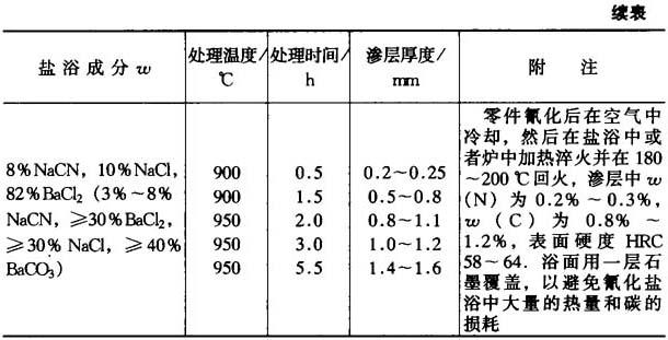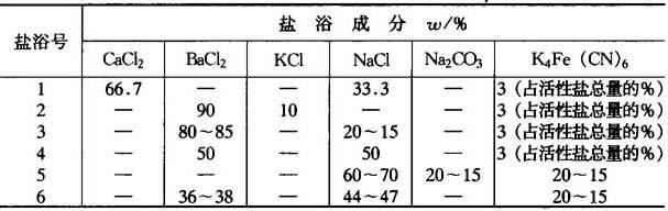 表15-38为结构钢液体碳氮共渗盐浴成分及规范.表15-37为含黄血盐的碳氮共渗盐浴成分. 表15-38 结构钢液体碳氮共渗盐浴成分及规范
